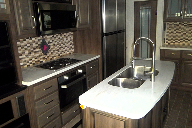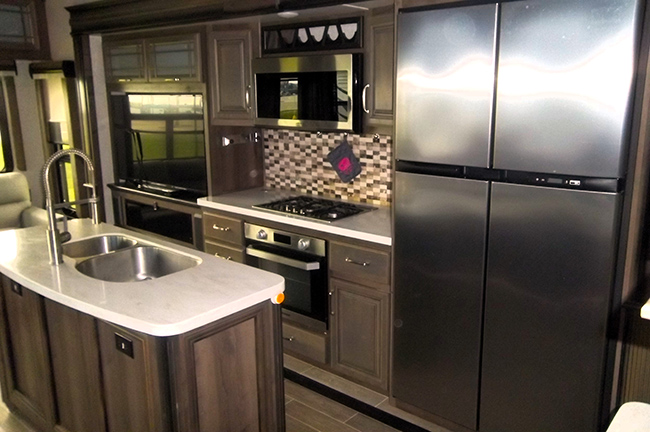 The kitchen is equipped with stainless steel appliances, a large side-by-side residential refrigerator, convection microwave, range with oven, island galley with dual-basin sink, and ample storage space. Free-standing dinette table and chairs.