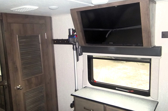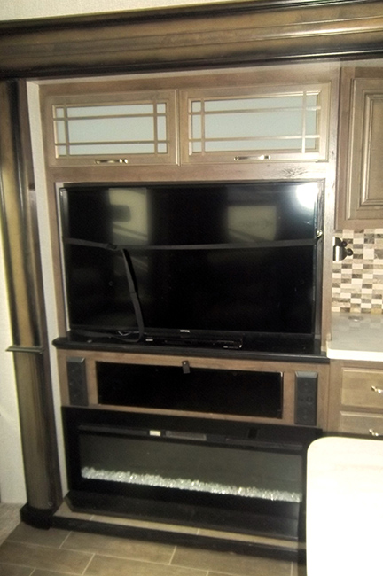 The living area features a cozy fireplace and a large 50" flat-screen TV, rear sofa sleeper, theater-style power recliners with heat and massage, and a central vac system.