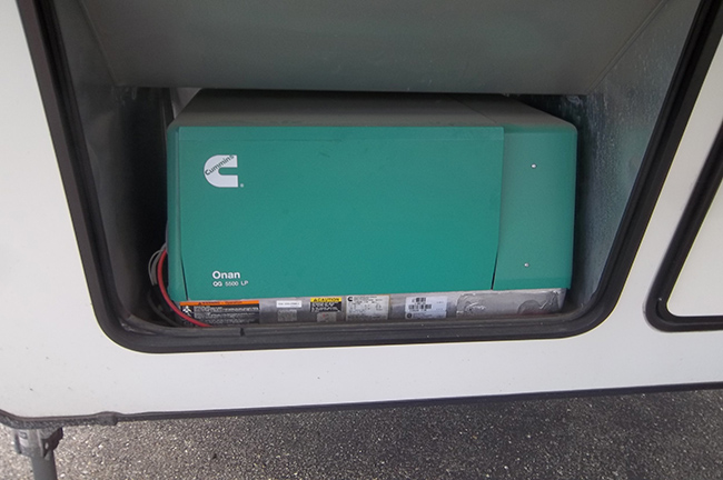 Outside features include two power awnings, outdoor speakers, fold-out easy-access entry step, auto-leveling system, 5500w Onan LP generator, rear camera with wireless remote monitor, and plenty of storage. Recently upgraded with new tires.