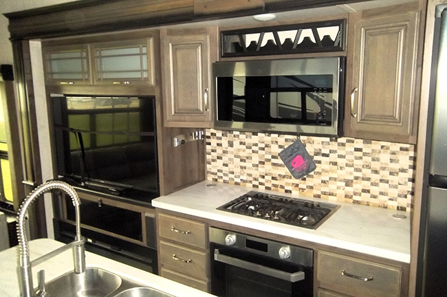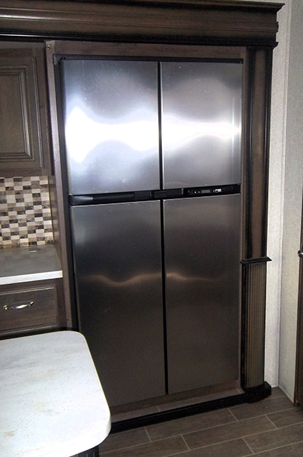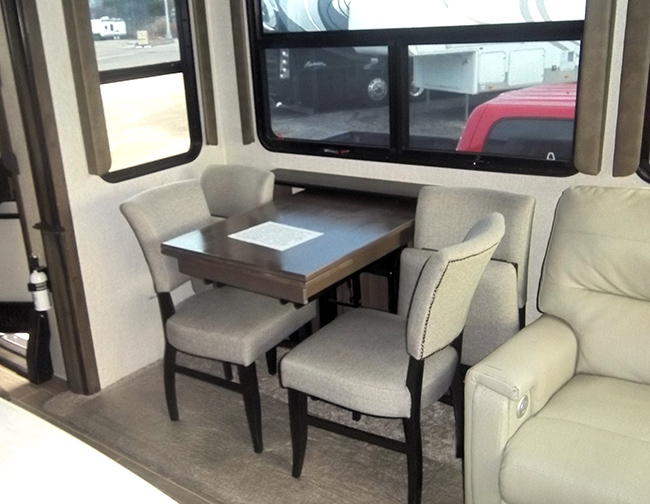 The kitchen is equipped with stainless steel appliances, a large side-by-side residential refrigerator, convection microwave, range with oven, island galley with dual-basin sink, and ample storage space. Free-standing dinette table and chairs.