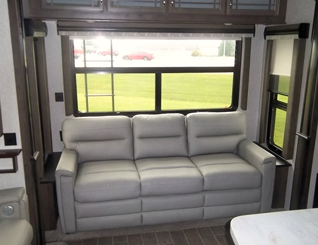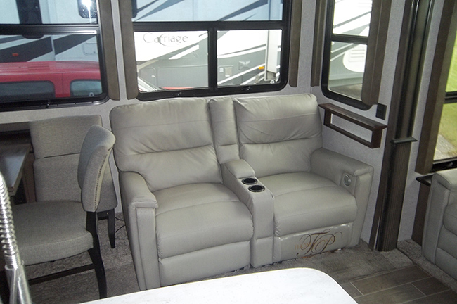 The living area features a cozy fireplace and a large 50" flat-screen TV, rear sofa sleeper, theater-style power recliners with heat and massage, and a central vac system.