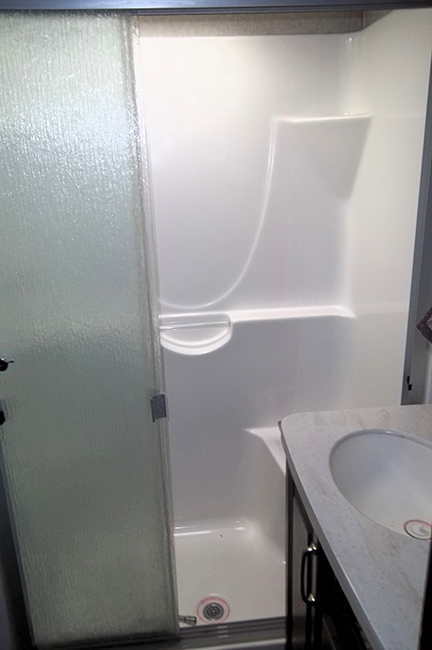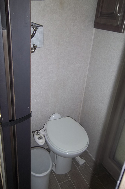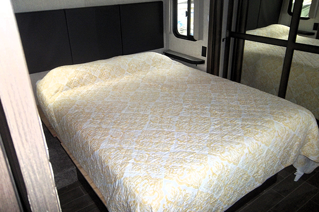 The master bedroom includes a comfortable king-sized bed, front wardrobe storage, washer/dryer prep, bedroom TV, and a private bathroom with a spacious shower, linen cabinet, foot-flush toilet, sink, and vanity.