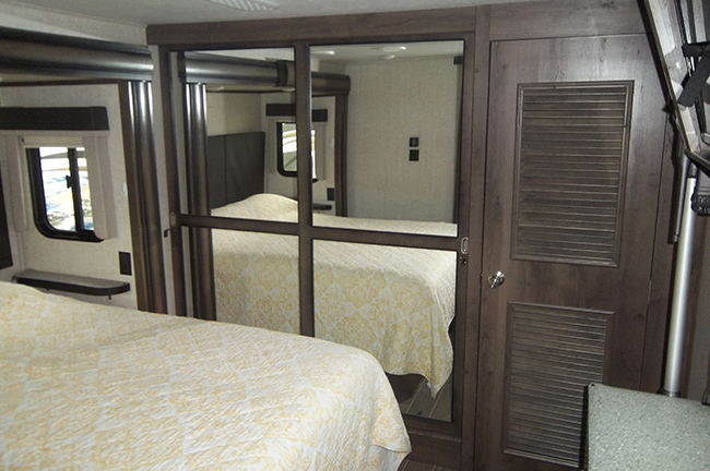 Outside features include two power awnings, outdoor speakers, fold-out easy-access entry step, auto-leveling system, 5500w Onan LP generator, rear camera with wireless remote monitor, and plenty of storage. Recently upgraded with new tires.