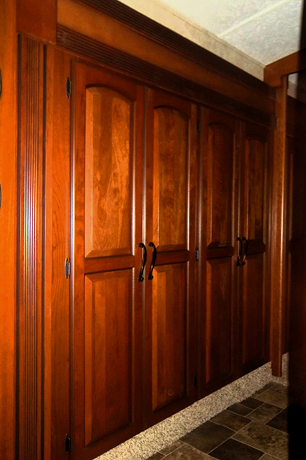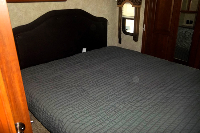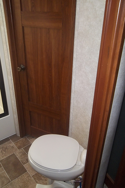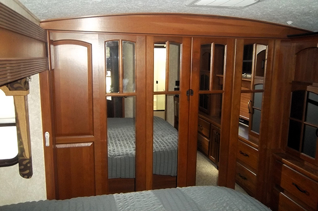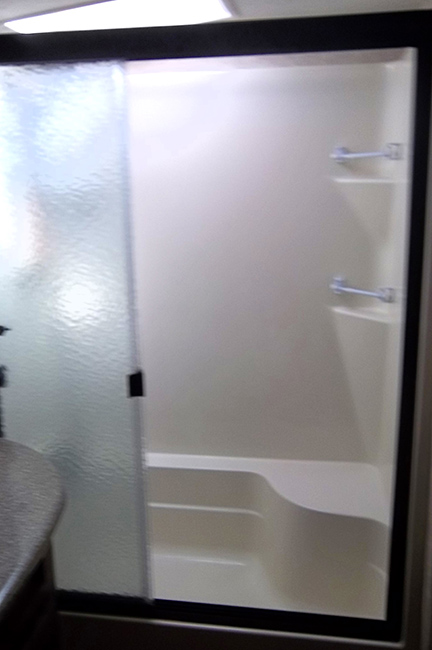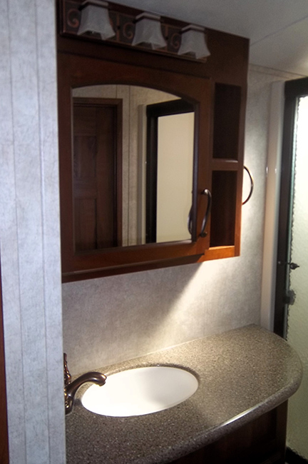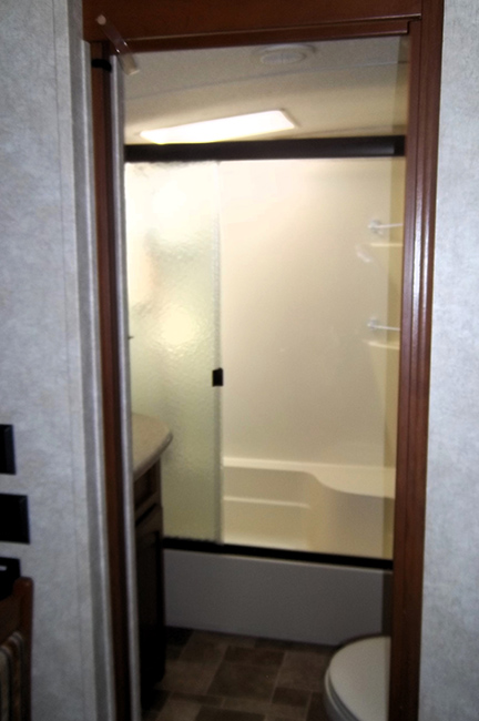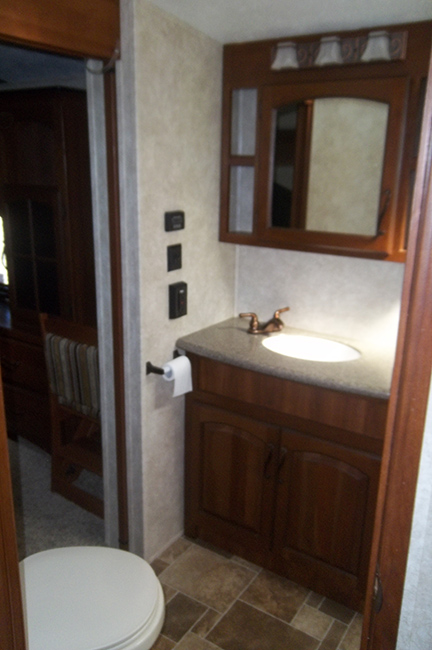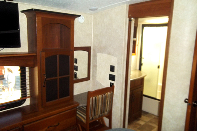 Front master king bed slide-out, front wardrobe storage, hallway storage, bedroom vanity with stool, bedroom TV. Private side bath with dual entrance doors, walk-in shower with glass enclosure, sink, vanity, medicine chest, and foot-flush toilet.