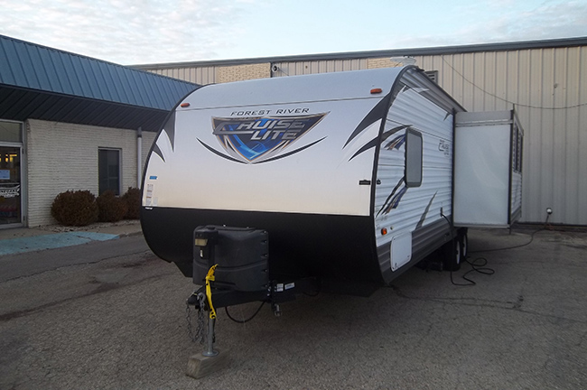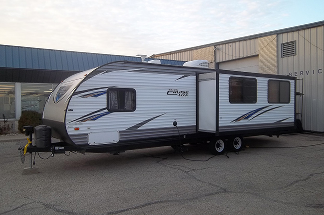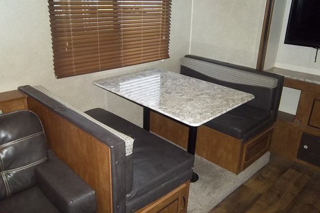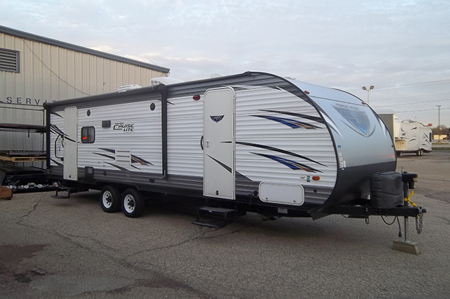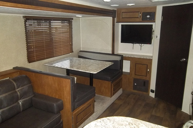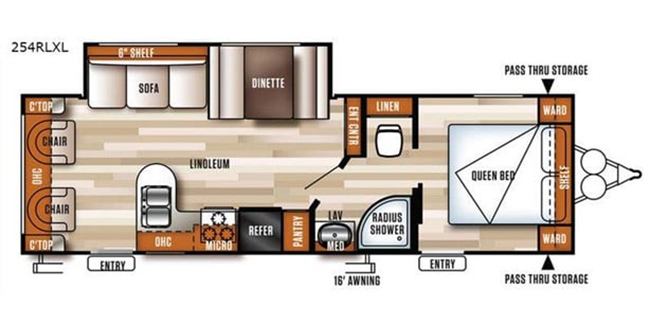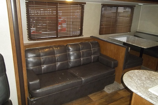 This rear living Salem Cruise Lite travel trailer model 254RLXL by Forest River has everything you need to enjoy camping to the fullest! One large slide out with a sofa sleeper unit and a booth style dinette entertainment center with LED wall mounted TV, stereo system w/DVD player just off the slide out along the interior living area wall. Rear lounge with a single recliner.