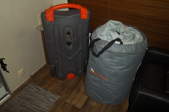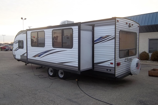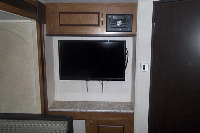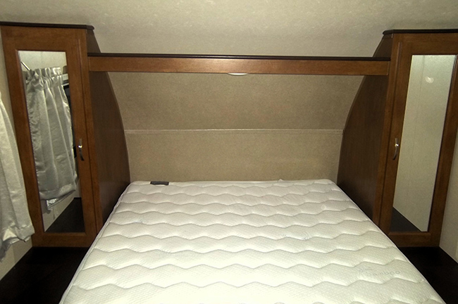 The front bedroom features a second outdoor entry. The front bedroom offers a queen-sized bed along with dual bedside wardrobes, plus an overhead shelf for your things. Ducted roof mounted A/C unit, power awning, exterior speakers, power tongue jack, aux battery, rear camera w/ wireless remote monitor, power stabilizer jacks and spare tire. Equalizer hitch, full exterior cover, and tote tank included.