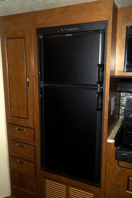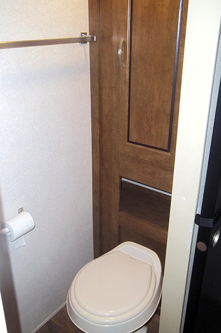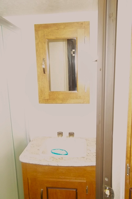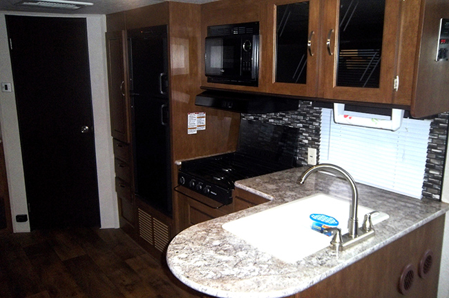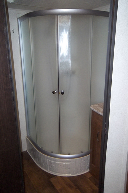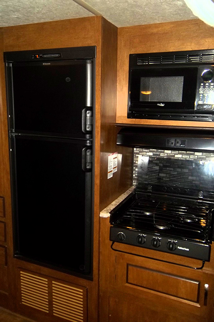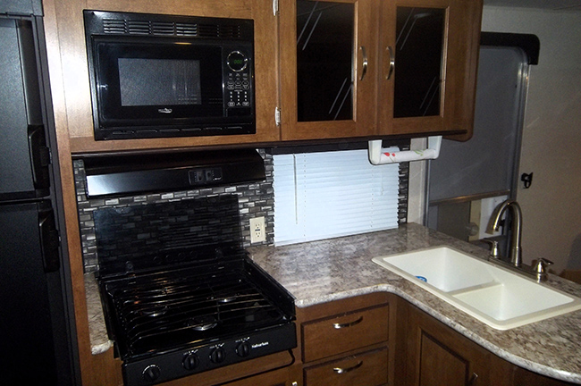 The kitchen features an L-shaped countertop, dual basin sink, three burner range with overhead microwave oven, abundant upper and lower storage cabinets, 6 cu ft refrigerator w/ upper freezer storage, and pantry for food storage. A walk-through bath features a sink with medicine cabinet and corner radius shower on one side, and a toilet with linen storage above.