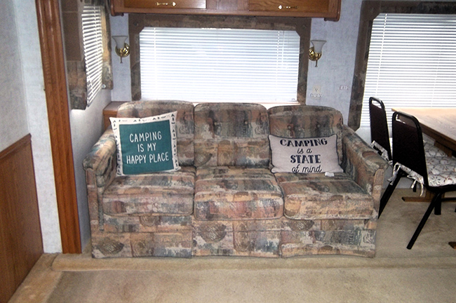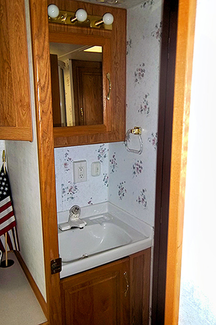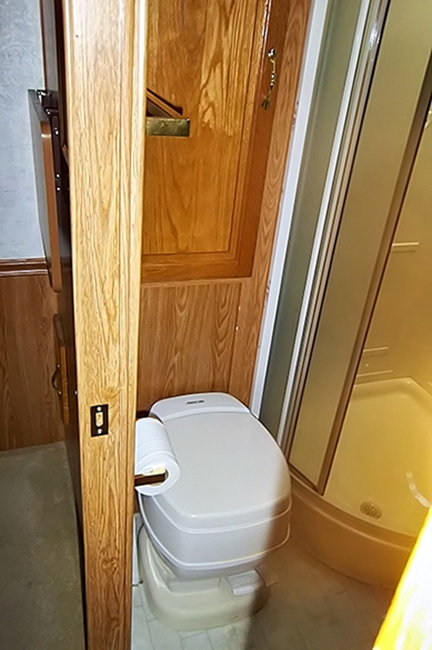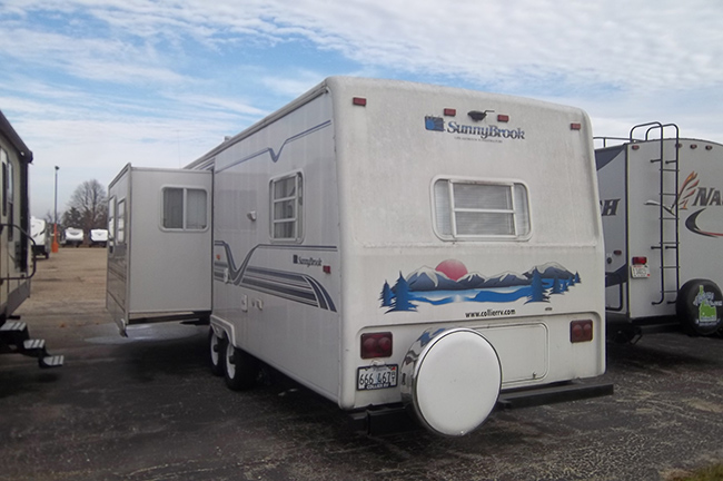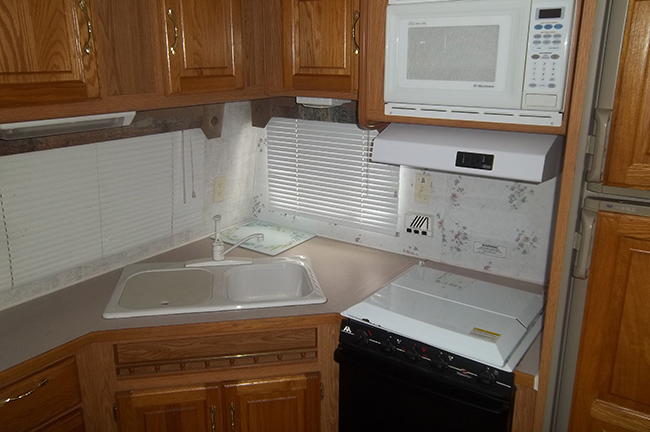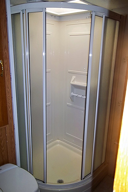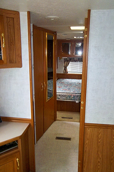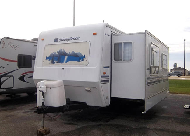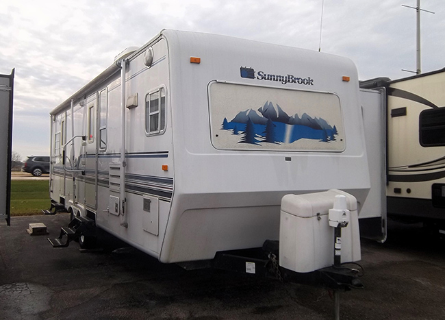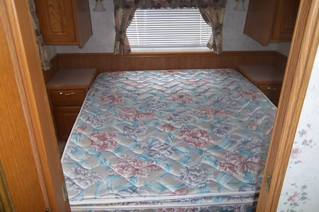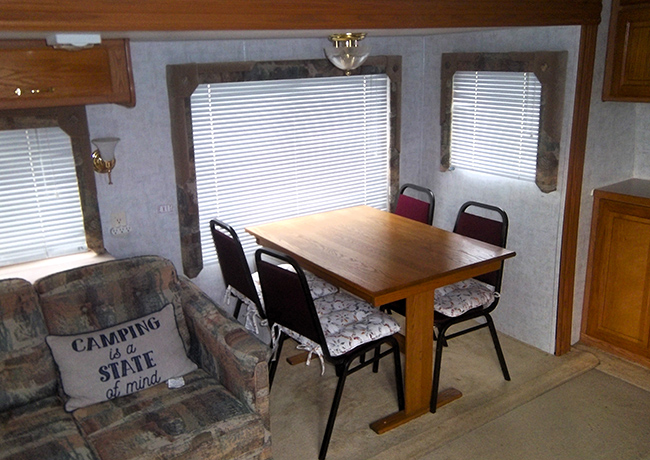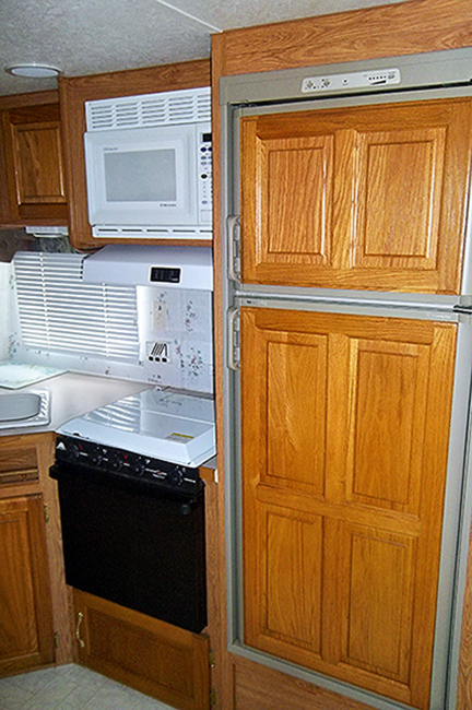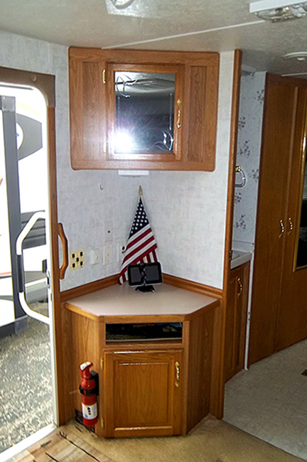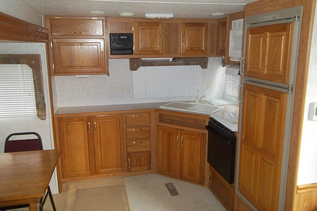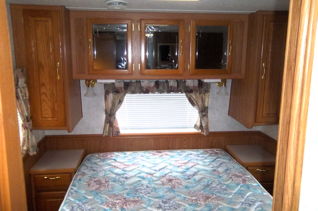 Aluminum structure with fiberglass end caps and side walls. One slide-out. Rear queen bed with under-bed storage, two shirt wardrobes/nightstands, day/night shades, sofa hide-a-bed, free-standing dinette table and chairs, Dometic large double-door refrigerator, DSI gas/electric water heater, microwave oven, three-burner range/oven, AM/FM stereo, oak cabinet doors, radius shower with glass door and skylight, outside shower, four leveling scissor jacks, 12V power hitch jack, molded gas bottle cover, solid spare tire carrier, awning with center support, auxiliary battery, rear camera with wired remote monitor, and equalizer hitch.