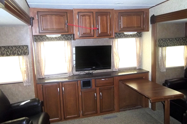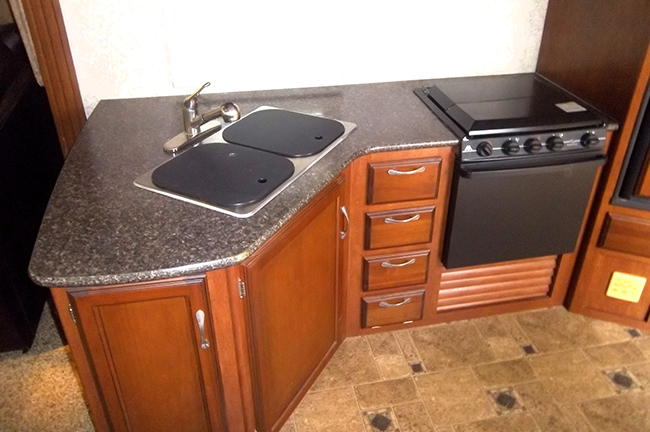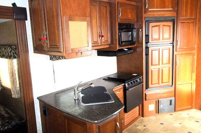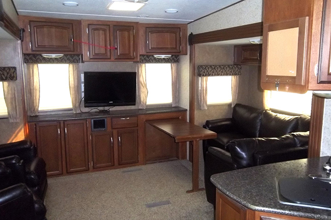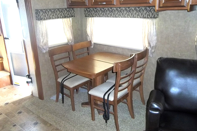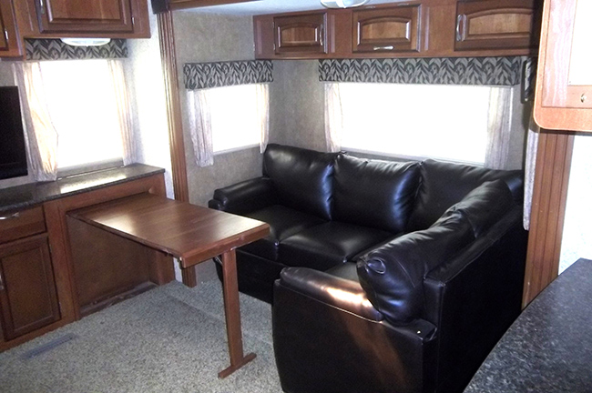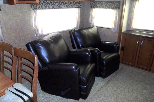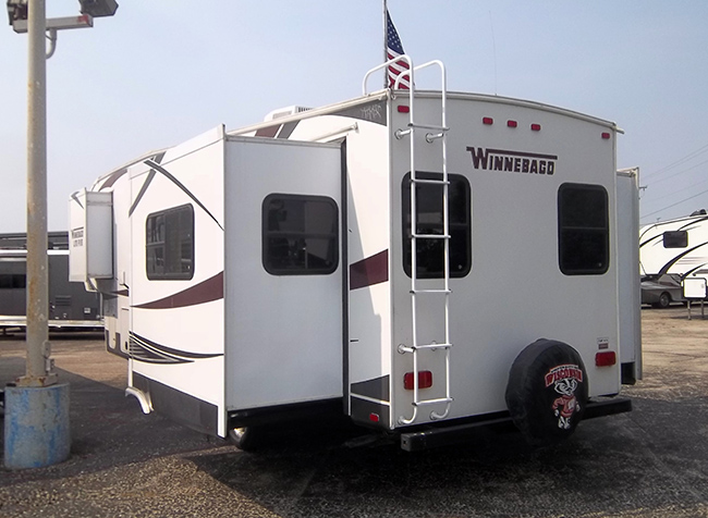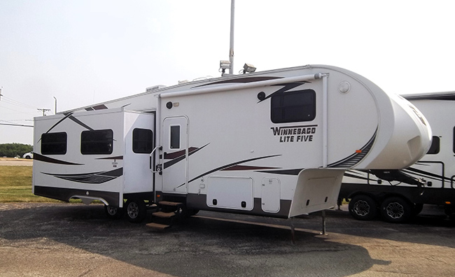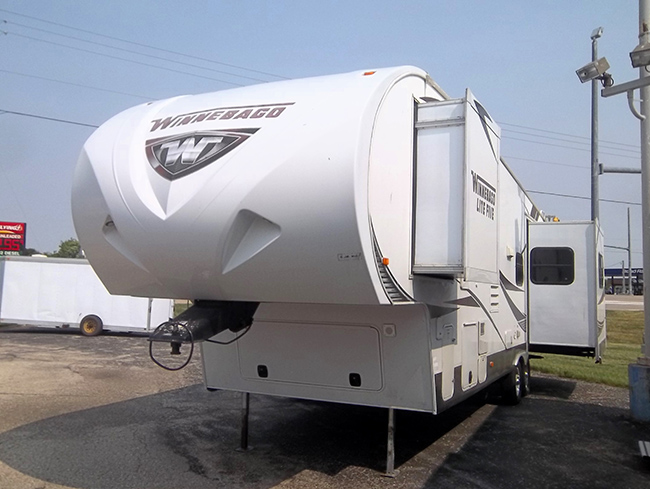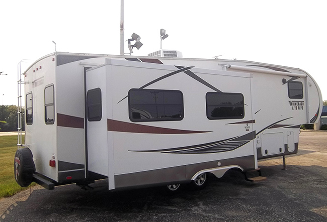 The Winnebago Lite Five 30FWRES is a rear‑living fifth wheel focused on residential comfort. It features a spacious layout with multiple slide-outs, a free-standing dinette with four chairs, two rocker recliners, rear entertainment center, fold-out expandable table, and an L-shaped sofa. Additional features include a full kitchen with three-burner range and oven, refrigerator, microwave, dual sinks, solid-surface countertops, and abundant storage.