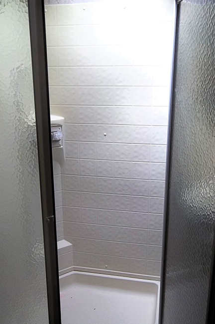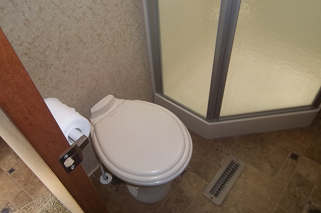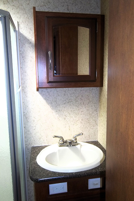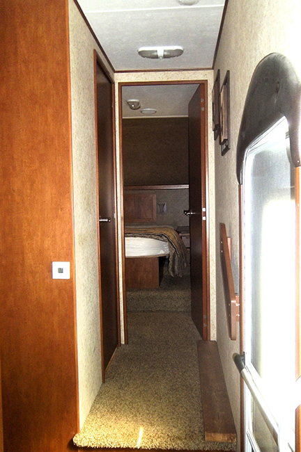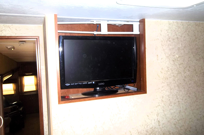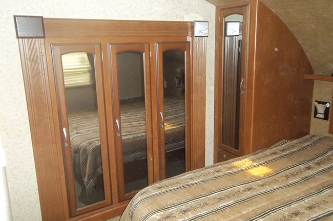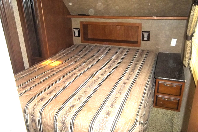 The front master queen bedroom includes a slide-out wardrobe and a second flat-screen TV. The private bathroom features a step-in shower, vanity with sink, and medicine chest. Additional amenities include ducted roof A/C, power awning, rear ladder, stabilizer jacks, and spare tire.