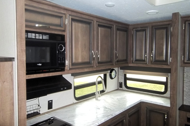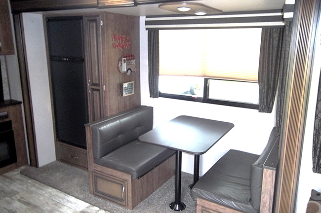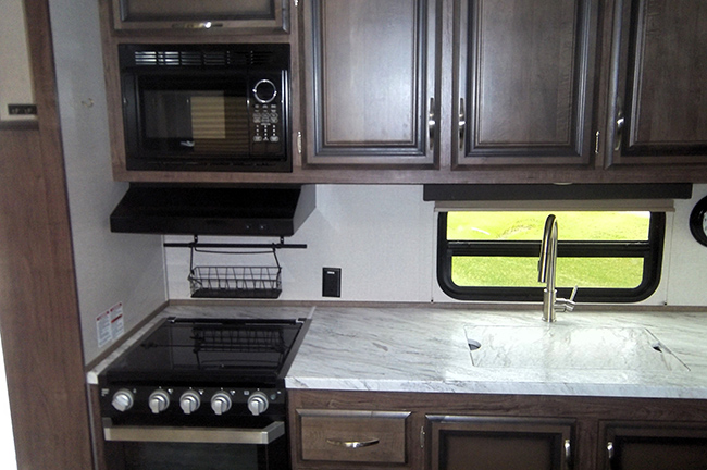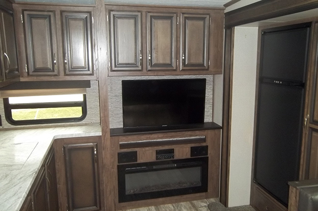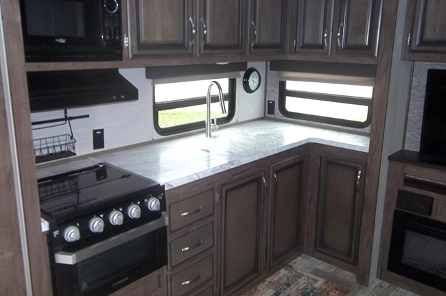 Features include a slide-out with booth-style dinette, pantry storage, and refrigerator. Relax on the sofa and enjoy the rear entertainment center with large LED TV and electric fireplace. Both the sofa and dinette convert into additional sleeping areas. The galley includes abundant countertop space, microwave, three‑burner range with oven, and a farmhouse-style sink with high-arch faucet.