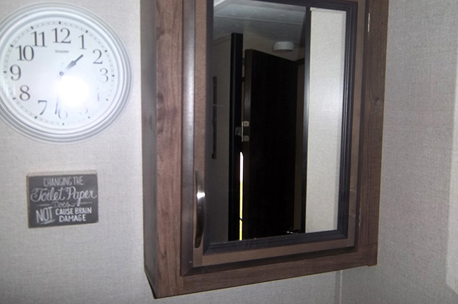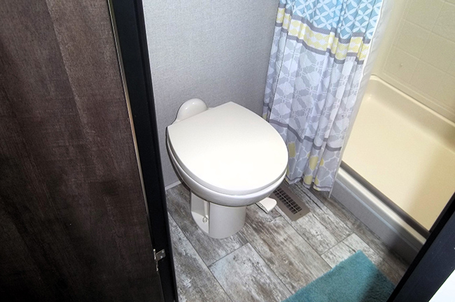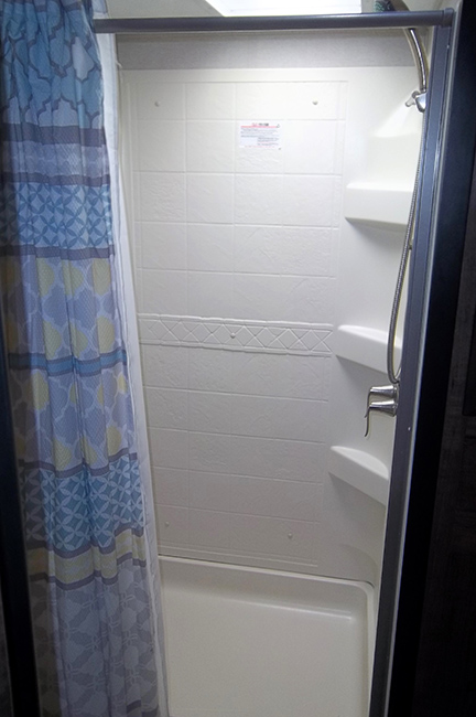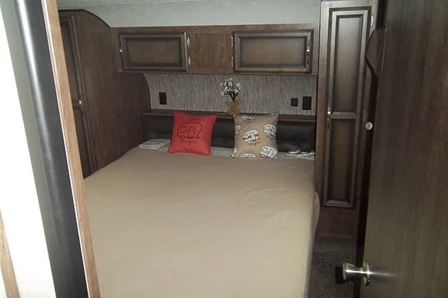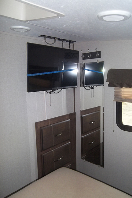 The front master queen bedroom includes a wall-mounted TV. The private bath features a step-in shower, vanity with sink, and medicine chest. Additional amenities include ducted A/C, easy-access fold-out steps, rear ladder, aluminum wheels, auxiliary battery, and spare tire.