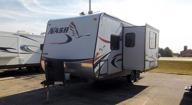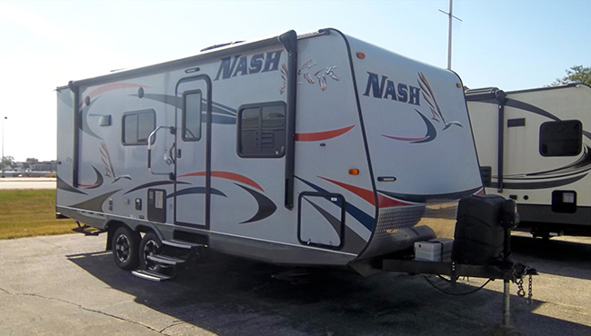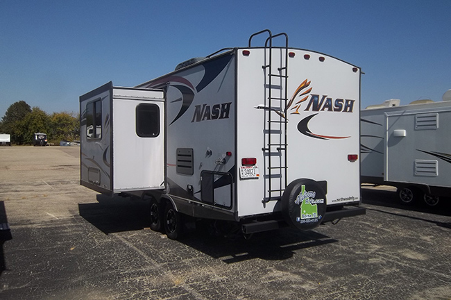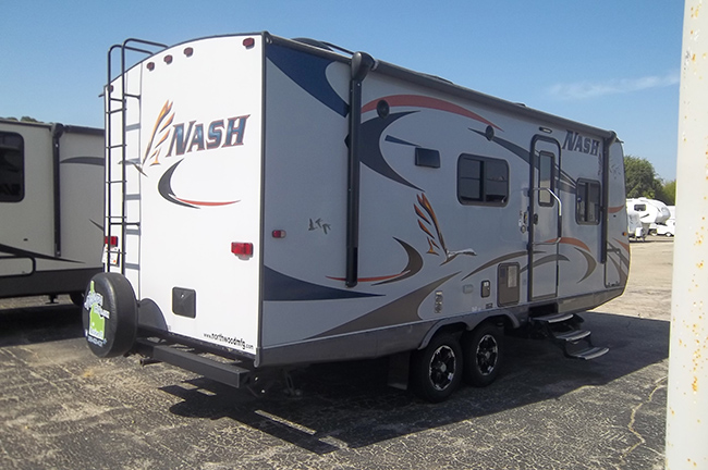 The Nash 23D by Northwood is built for durability with fully welded thick‑wall aluminum framing, a Northwood-built Ironhorse chassis, thermal pane windows, Corona-treated fiberglass, and all-conditions/four-season insulation. This unit includes a Solar Roof Panel Package for off-grid capability, power tongue jack, auxiliary battery, power patio awning, crank-down stabilizer jacks, spare tire package, and rear ladder.