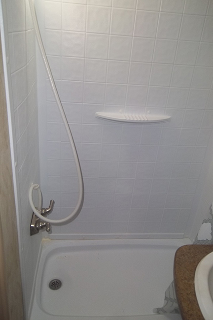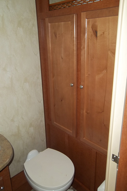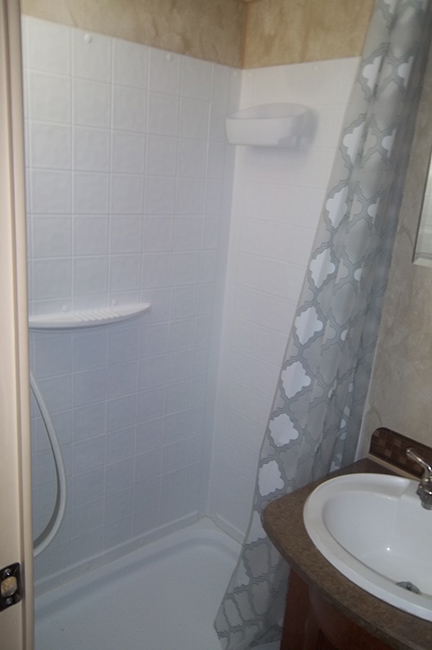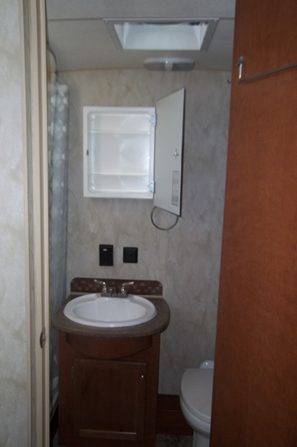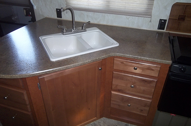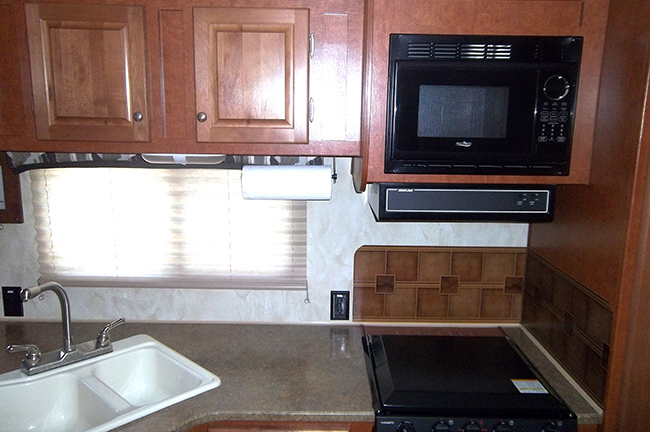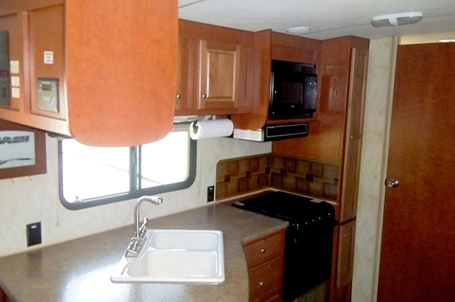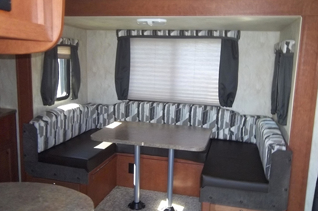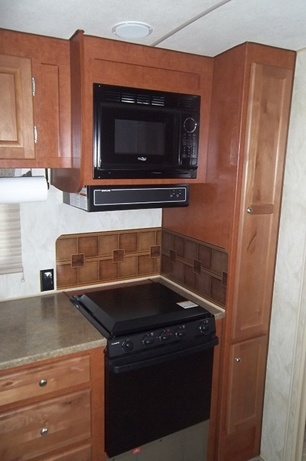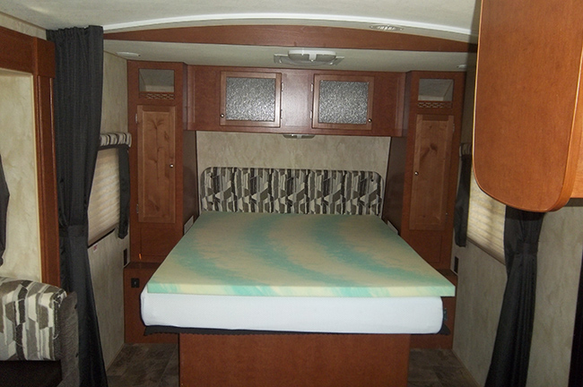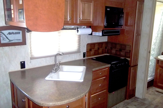 Inside, the cathedral-arched ceiling creates an open feel. The large U-shaped dinette sits in the slide-out, and the front queen master bed includes an upgraded mattress. Entertainment features include an AM/FM stereo with Bluetooth. The center galley offers a microwave, three-burner range with oven, pantry storage, and ample counter space. The rear bath includes a vanity, sink, medicine chest, wardrobe storage, and step-in shower stall. Recently upgraded tires and equalizer hitch included.